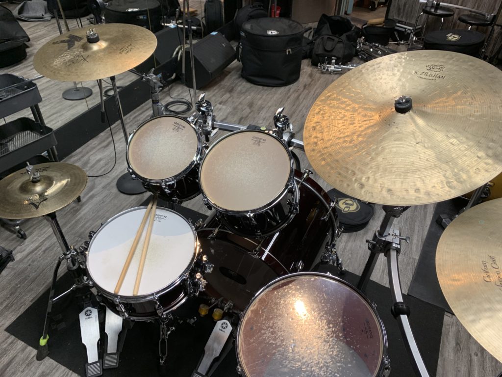 今は基本セッティングなので点数は少なめですが、ここから太鼓やシンバルも増やす予定です。スタンド式の場合だと大量のスタンドの撤収作業が発生しますが、ラックシステムならそれがない。