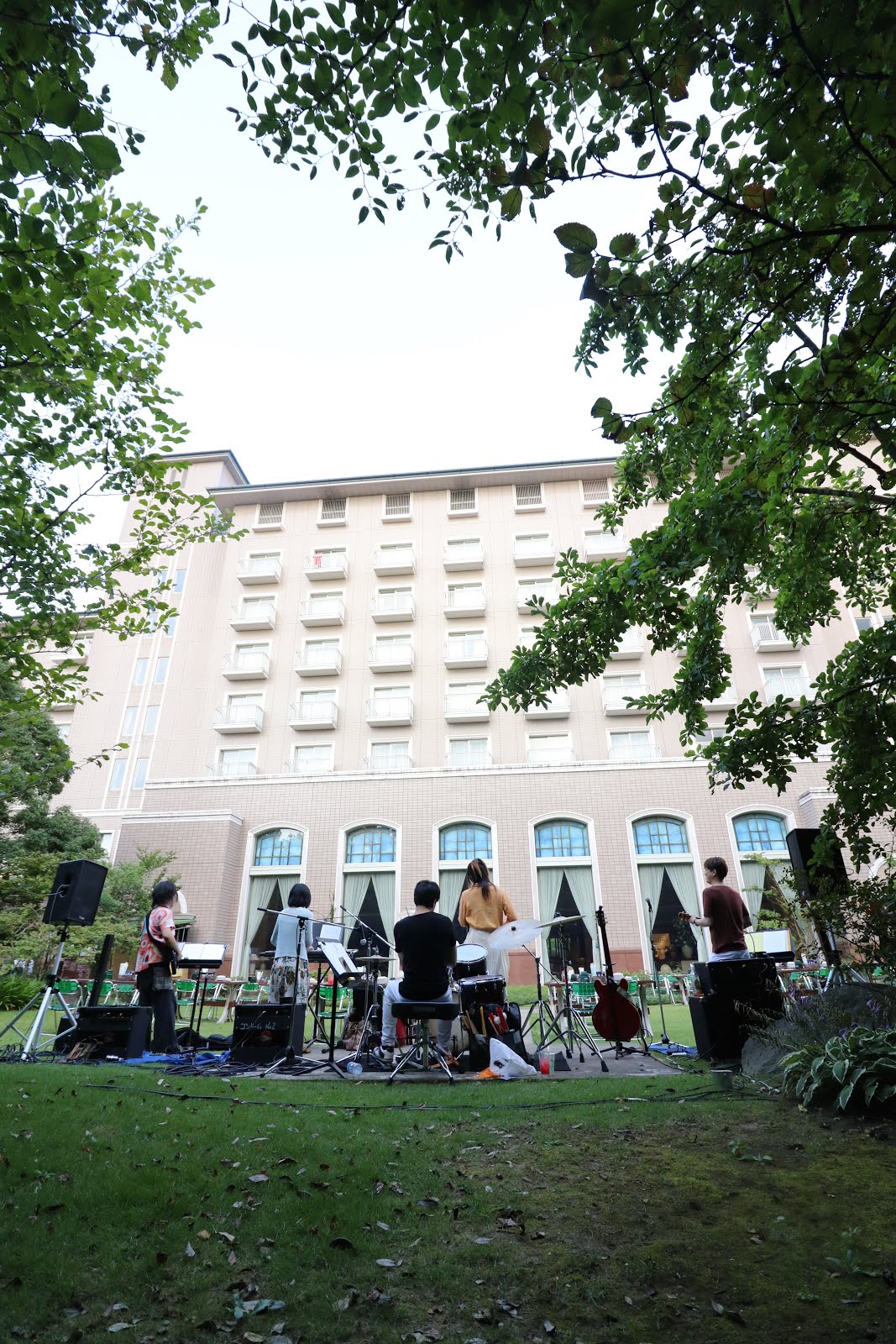 本番は外!ホテルを目の前にしての演奏です。