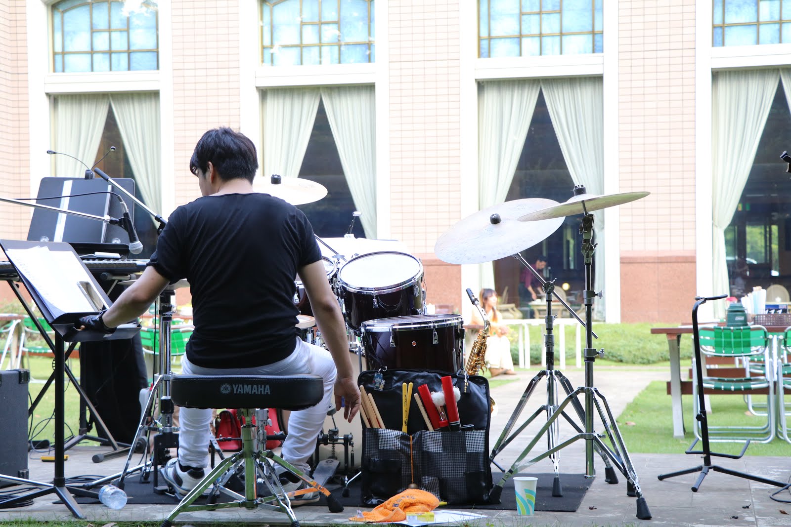 お客様のバーベキューを楽しむ姿を見つつの演奏です。